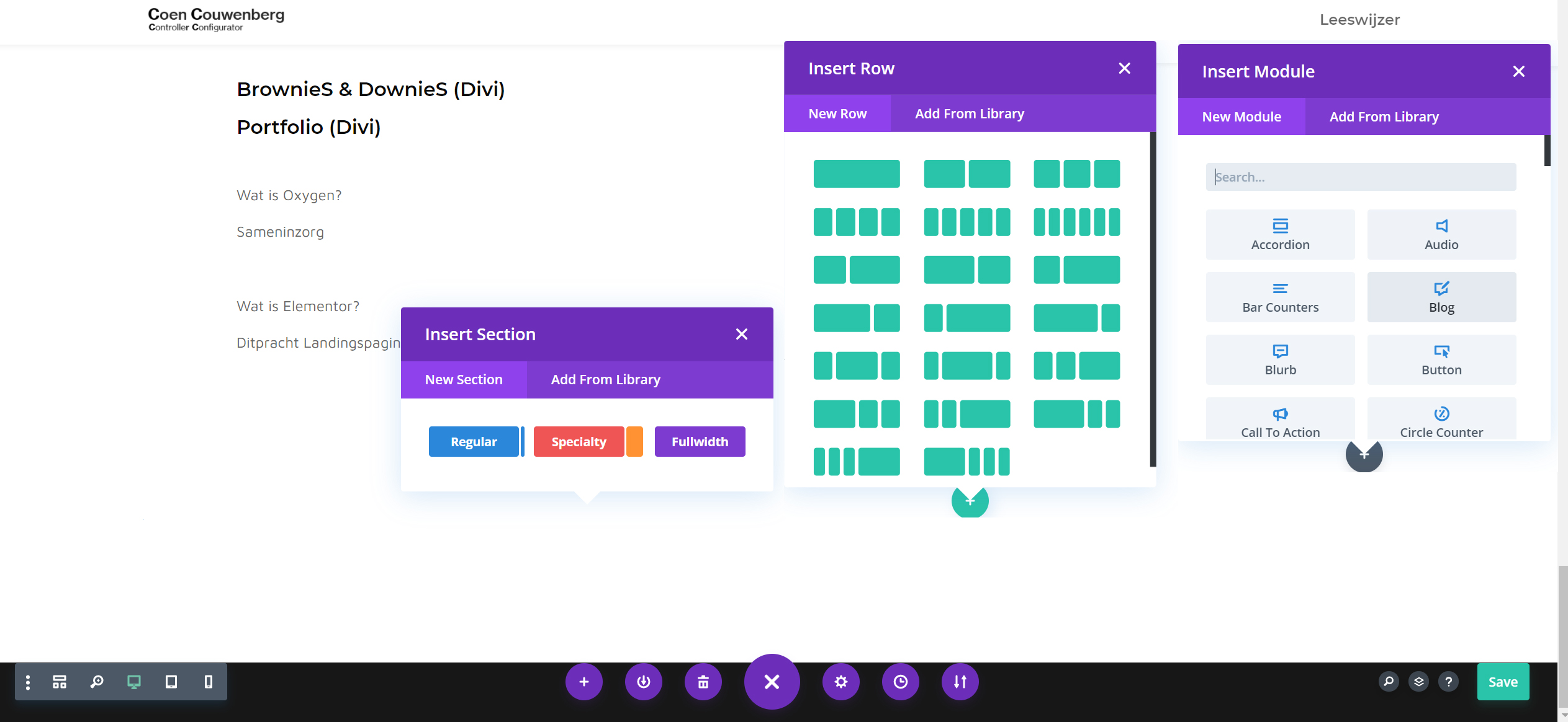 Met Divi maak je gebruik van Sections, Rows en Modules. Waarbij Sections de sectie is waarin je iets gaat maken je kunt hierbij kiezen tussen een Regular (normale breedte) en Fullwidth, voor bijvoorbeeld een banner. Bij Row geef je aan welke verhouding je in je rij wilt hebben, meestal gebruik ik de linksboven row, zo is dit blog bericht ook is opgedeeld. Bij Module geef je aan wat je erin wilt gaan zetten, bijvoorbeeld een tekst of een knop of een van de ander 30+ opties.
